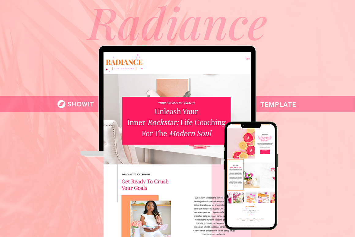 Get ready to crush your goals with the Radiance Showit Website Template – your ultimate weapon to carve out a riveting digital presence and captivate your dream clients. Tailored with modern Life Coaches, Course Creators, Service Providers, and Bloggers in mind, this template is built to perfection with an emphasis on ease of use, time savings, and of course, no coding required! With Showit’s handy drag & drop builder feature, customizing this template is as simple as one, two, click!
